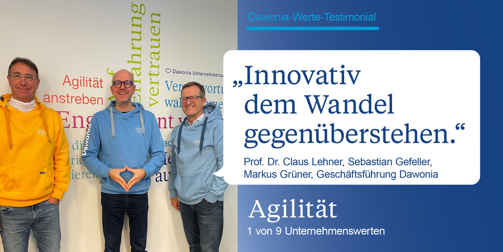 Unsere Mitarbeiter:innen haben die Freiheit, ihre Aufgaben eigenständig und verantwortungsvoll zu erledigen und können dadurch schneller und effektiver agieren. Als Arbeitgeberin schaffen wir daher Raum für Innovation und fördern die Eigenverantwortung jedes einzelnen Teammitglieds. In dieser dynamischen Arbeitsumgebung tragen unsere Talente zum gemeinsamen Erfolg bei. Agilität gehört neben Verantwortung, Vielfalt, Engagement, Erfahrung, Geborgenheit, Herzlichkeit, Zukunft und Wachstum zu den zentralen Unternehmenswerten von Dawonia.