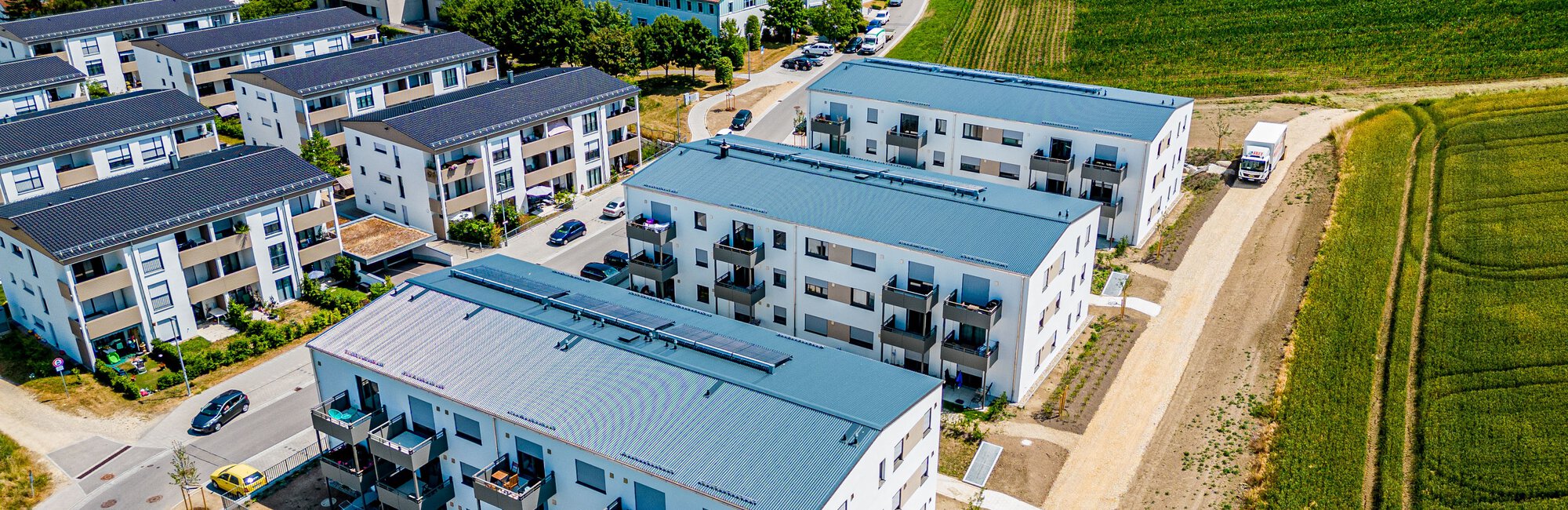 Bei Regensburg wurde ein ressourcenschonender und ernegieeffizienter Neubau mit drei freistehenden Baukörpern und flachgeneigten Satteldächern mit Solarthermieanlagen errichtet.