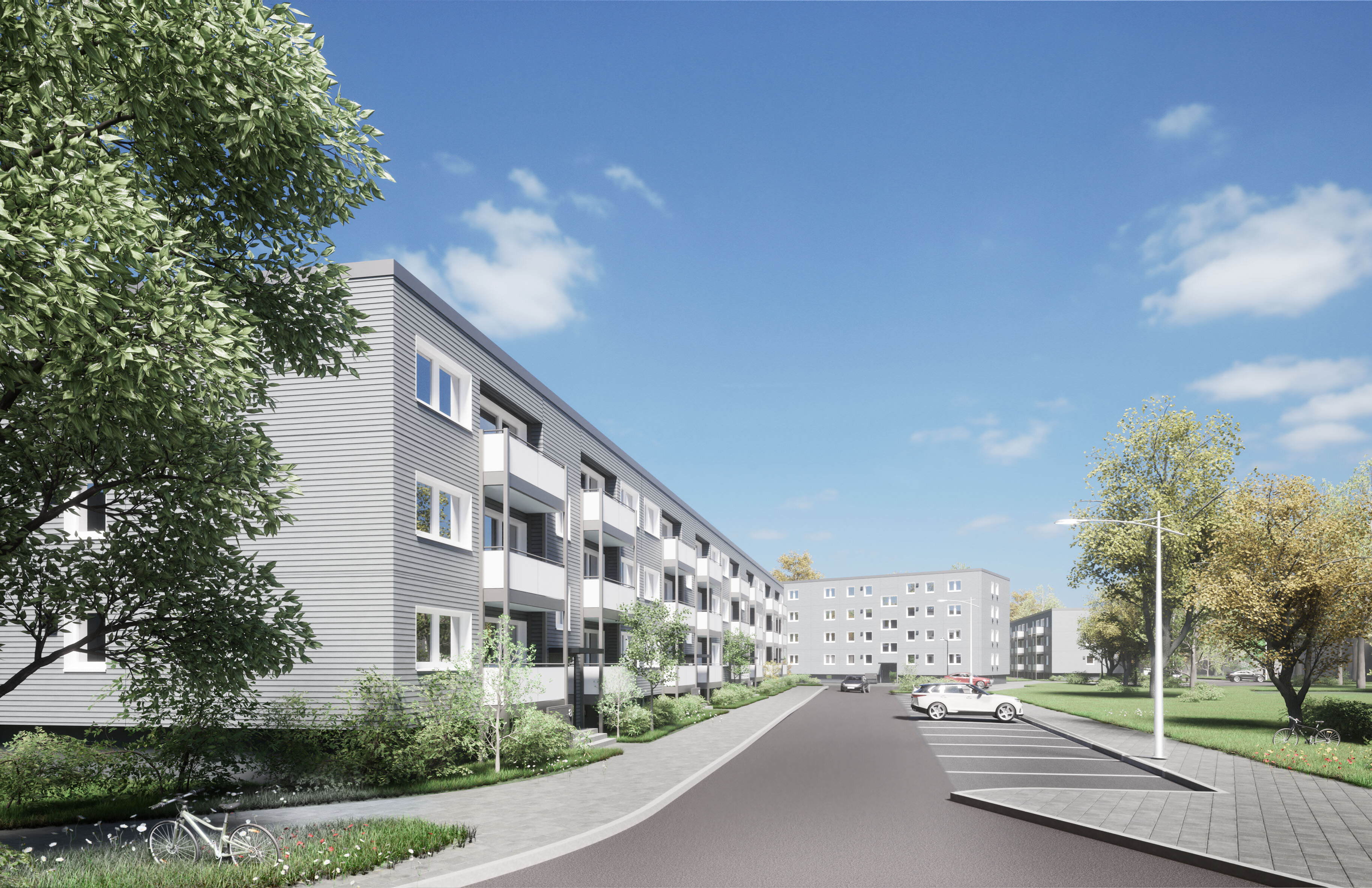 Die drei Mehrfamilienhäuser werden energetisch optimiert, um den KfW-Effizienzhausstandard 55 zu erreichen und den Wohnkomfort zu steigern.