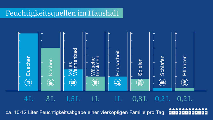 Das Bild zeigt Feuchtigkeitsquellen im Haushalt einer vierköpfigen Familie mit einer täglichen Abgabe von 10-12 Litern. Duschen erzeugt 4 Liter, Kochen 3 Liter und ein volles Wannenbad 1,5 Liter. Wäsche trocknen und Hausarbeit tragen je 1 Liter bei, während Spielen 0,8 Liter sowie Schlafen und Pflanzen jeweils 0,2 Liter freisetzen.